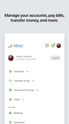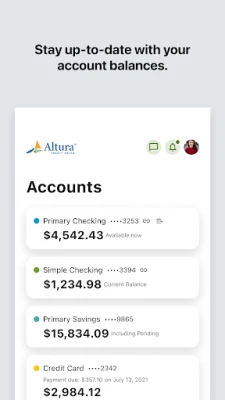 Altura's Mobile Banking app is convenient and secure, allowing you to manage your money from anywhere at anytime. You can set text alerts on your account so you are informed about account activity that matters to you and create your own secure credentials to access the app whether through your finger print or a unique PIN.