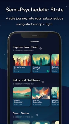 Relax, explore your mind, and sleep better with the Lumenate app. Utilizing research-backed light sequences from your phone's flashlight, Lumenate guides you into an altered state of consciousness, blending deep meditation and classic psychedelics. In this state, you can expect to be fully immersed in the present moment, experiencing powerful closed-eye visuals and exploring your mind from a new perspective.