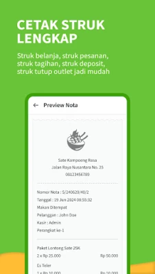 Mulai dari catat penjualan, cetak struk belanja pada printer, kirim struk belanja via whatsapp, perhitungan total penjualan otomatis, penjualan dine in, take away, gofood, shopeefood, perhitungan share revenue otomatis, terima pembayaran digital, buat harga menu berbeda untuk varian berbeda, manajemen diskon, promo penjualan, pajak, catat database pelanggan, cetak pesanan ke dapur dan bar. semuanya untuk mempermudah dan mempercepat transaksi di meja kasir.