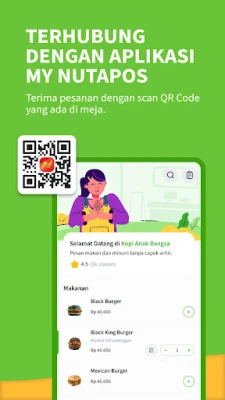 Tingkatkan omset penjualan dengan pemesanan menu dengan QRCode, Pelanggan bisa memesan menu tanpa capek antri di kasir dan tanpa instal aplikasi selain itu pelanggan juga bisa langsung bayar dengan uang digital (gopay, shopeepay, ovo, dana dll) langsung dari My nutapos. Cukup scan QRCode yang ada di meja lalu pilih menu yang dipesan dan bayar dengan dompet digital. Pesanan otomatis diterima oleh kasir dan dapur.