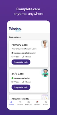 Teladoc Health connects you with complete care, at your convenience and an affordable cost. You’ll find what you need to get well—like 24/7 care—alongside primary care, therapy and programs proven to keep you well.